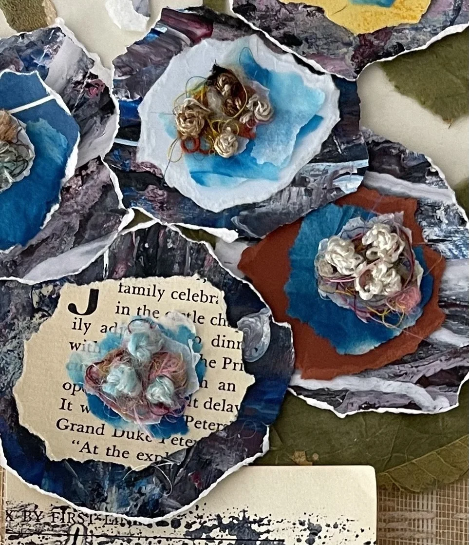 A piece currently on my work table is this vase of flowers created with painted paper, vintage book pages, and lots of thread and fibers for the centers. It will be mounted on a vintage book cover.